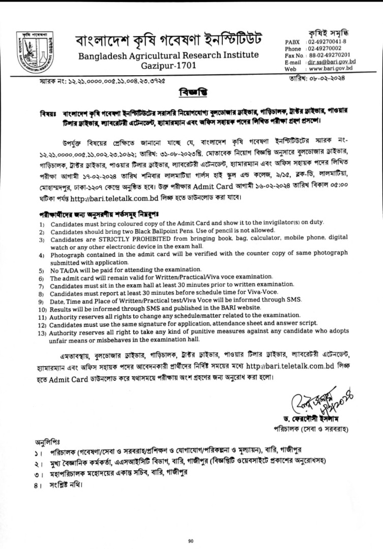 স্মারক নং - ২৭৩১; মৌখিক পরীক্ষার বিজ্ঞপ্তিঃ বাংলাদেশ কৃষি গবেষণা ইনস্টিটিউটের রাজস্বখাতভুক্ত ও অস্থায়ীভাবে সৃজনকৃত ৯ম হতে ৫ম গ্রেডের বিভিন্ন পদের লিখিত পরীক্ষায় নির্বাচিত প্রার্থীদের মৌখিক/ব্যাবহারিক (প্রযোজ্য ক্ষেত্রে) পরীক্ষা গ্রহণ প্রসঙ্গে।